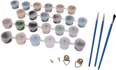 Sada 24 očíslovaných kelímků s barvou, tři štětce pro různé tahy a závěsné háčky pro snadné vystavení hotového obrazu.