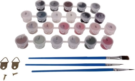 - Plátno na dřevěném rámu, sada akrylových barev, 3 × štětec, vzor/miniatura obrazu, 2 × háček + šroubky, 2 × bezstopý háček