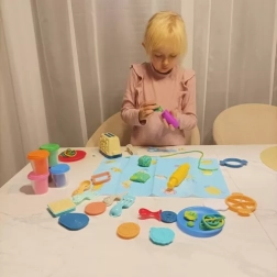 Díky 5 barvám modelíny lze barvy míchat a vytvářet nové odstíny. Bohaté příslušenství (váleček se vzory, vykrajovátka, náčiní, podložka) podporuje kreativitu, jemnou motoriku a společnou hru s rodiči i sourozenci.