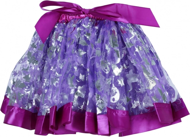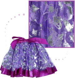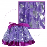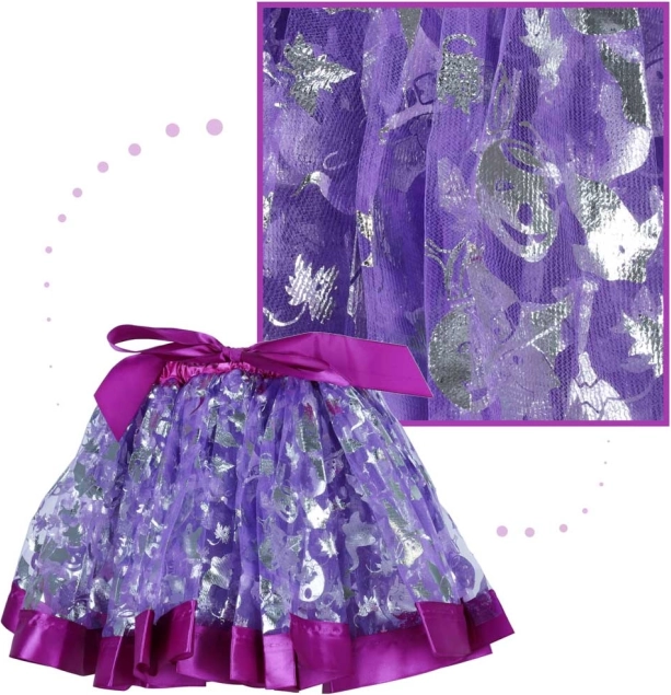 Fialová sukénka s lesklými stříbrnými vzory a pružným pasem se snadno přizpůsobí různým postavám.