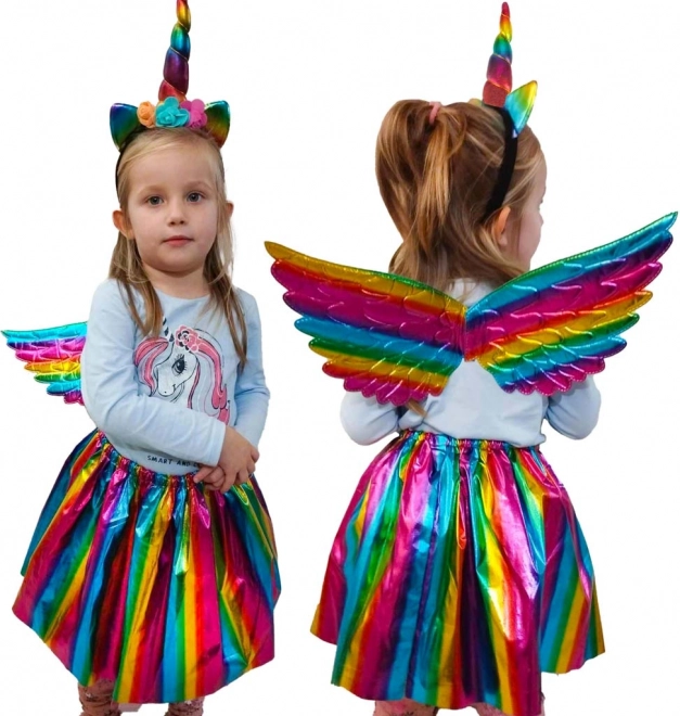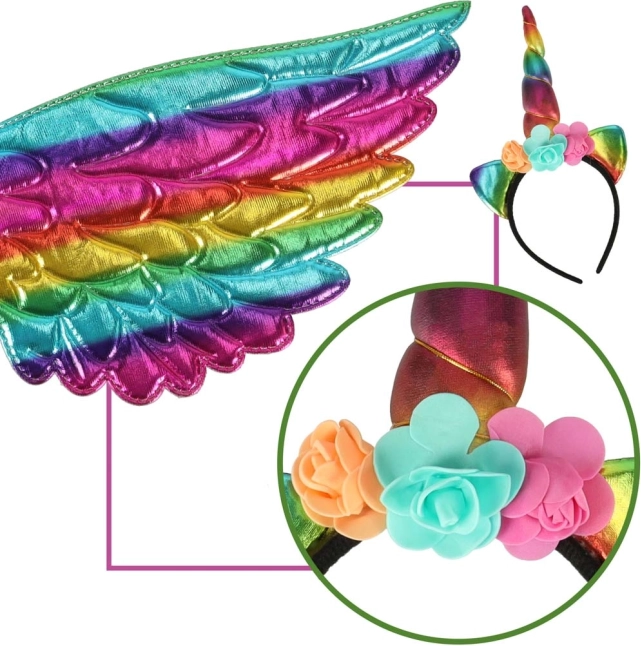 V balení najdete vše potřebné - duhová křídla, čelenku s rohem a sukni, ideální pro jakékoli oslavy.