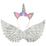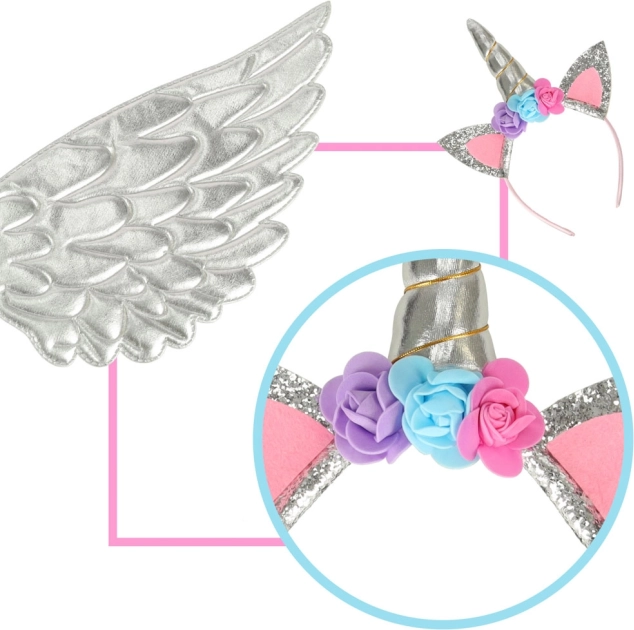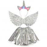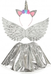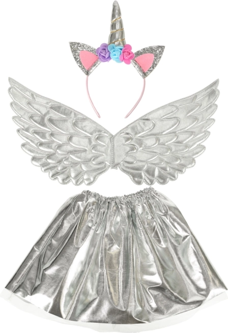 Tento nádherný kostým vám umožní proměnit vaše dítě v jedinečného jednorožce. Skládá se ze stříbrné sukně, elegantních křídel a detailně zpracované čelenky s růžkami. Ideální pro každou příležitost, kde si dítě může užít pohádkovou hru.
