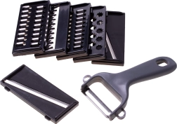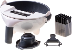 Díky této sadě snadno připravíte hranolky, okurkový salát, strouhaný sýr nebo jablka na koláč. Struhadlo lze pohodlně umístit na misku a vybrat si správný nástavec, takže strouhané nebo nakrájené produkty padají přímo do misky.