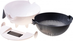 Otočný cedník zjednodušuje práci tím, že umožňuje okamžité odvodnění přebytečné vody po krájení. Lze jej také použít pro přecedění těstovin nebo salátu. Struhadlo je vybaveno rukojetí s ostny, která chrání prsty před pořezáním.