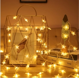 LED světelný řetěz s motivem hvězd rozsvítí každý interiér příjemným teplým světlem. Díky napájení 2× AA jej snadno zavěsíte kamkoli bez zásuvky. Délka 5 m, lehké provedení a jemný pastelový vzhled vytváří útulnou atmosféru do dětského pokoje, ložnice i na sezónní výzdobu.
