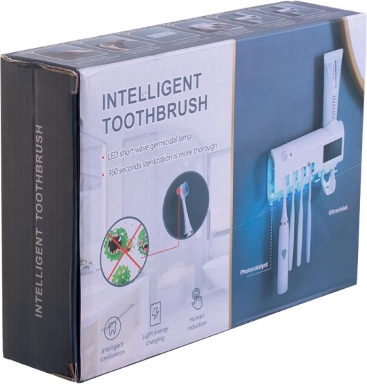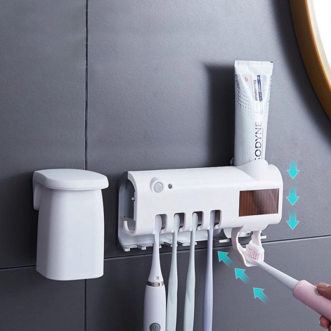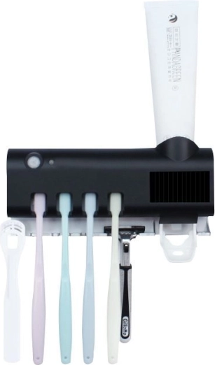 Držák pojme 4 standardní zubní kartáčky nebo hlavice elektrických zubních kartáčků a zubní pastu. Zařízení automaticky spustí dezinfekci a vytlačí na zubní kartáček správné množství zubní pasty. Používáním dávkovače zubní pasty zabráníte vzniku skvrn a plýtvání zubní pastou tím, že dávkujete ideální množství zubní pasty. Jeho decentní design bude dobře ladit se všemi styly koupelen. Je dokonalým řešením, díky němuž vám zubní kartáčky nebudou překážet v koupelně.