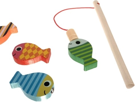 Barevné rybičky s magnety a dřevěný prut zábavnou formou rozvíjejí přesnost pohybu a soustředění. Děti chytají ryby, třídí barvy a počítají úlovky.