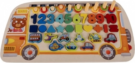 Součástí je bohatá výbava: číslice 0–9, matematické znaky, geometrické tvary, dřevěné kroužky na počítání, rybičky s magnetem, tyčky a puzzle s dopravními prostředky. Kvalitní dřevěné zpracování je odolné a příjemné na dotek, barvy jsou atraktivní a motivují k objevování.
