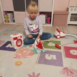 - Praktické funkce: Vysavač s funkcí sání, žehlička s tryskáním vody, pračka s realistickým bubnem.