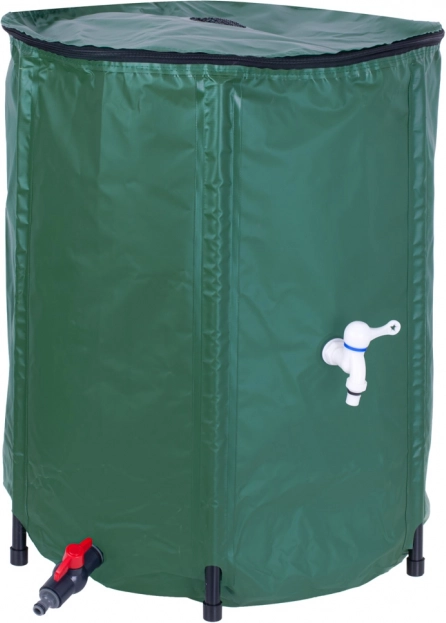 Promyšlená konstrukce s nohami a výztužnými trubkami zajišťuje stabilitu, zatímco přepad v horní části ochrání nádrž před přeplněním. Vodu odeberete pohodlně přes kohoutek, spodní vypouštěcí ventil nebo rozepnutím víka. Po sezóně sud rozložíte do kompaktních rozměrů a snadno uskladníte.