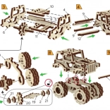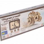 Model je vyroben z kvalitní překližky, skládá se bez lepidla a nářadí a je vhodný i pro začátečníky. Pro plynulý chod mechaniky stačí lehce promazat ozubená kola a osy voskem (např. ze svíčky), čímž snížíte tření a zvýšíte životnost.