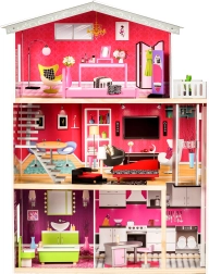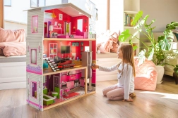 Užijte si hodiny hry s velkým dřevěným domečkem pro panenky malibu residence ECOTOYS – 3 podlaží, 4 pokoje, pohyblivý výtah a 10 kusů nábytku. Stabilní konstrukce, bez ostrých hran, pro panenky 27–28 cm, od 3 let.