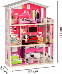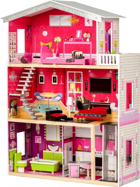 Malibu residence ECOTOYS je prostorný dřevěný domeček vysoký 114 cm, navržený pro panenky 27–28 cm. Nabízí tři samostatná patra a čtyři krásně ilustrované místnosti v moderním stylu. Profilovaná střecha a otevřená čelní strana zpřístupní každý kout, takže si děti vyhrají bez omezení.