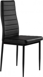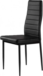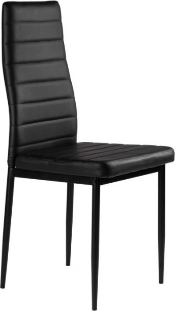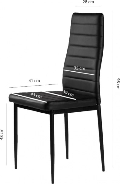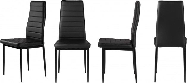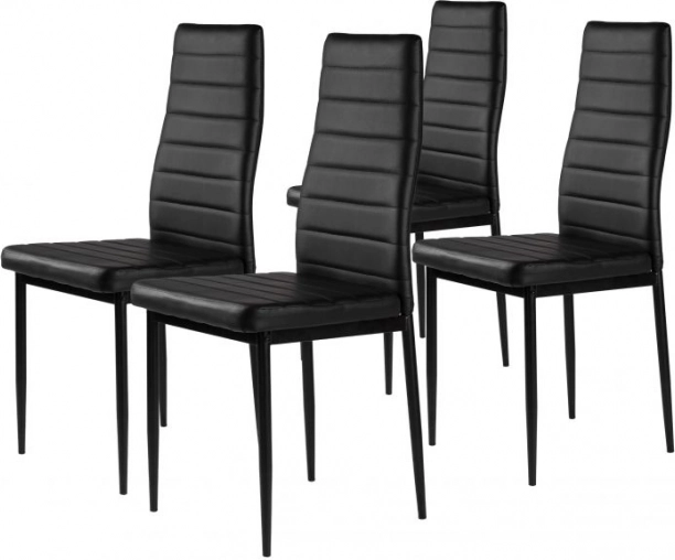 Elegantní sada čtyř jídelních židlí v černé barvě spojuje moderní design, pohodlné čalounění z eko kůže a stabilní ocelové nohy. Vysoké ergonomické opěradlo a měkká PU pěna zajišťují komfort i při delším sezení, snadno se udržují a unesou až 120 kg.