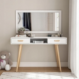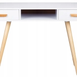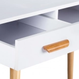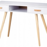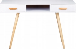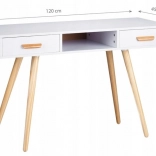 Laminovaná deska je odolná proti poškrábání a zabarvení, což oceníte při každodenním používání. Masivní borovicové nohy zajišťují pevnost a stabilitu bez nežádoucího pohybu. Dvě prostorné zásuvky a centrální otevřená nika pojmou kosmetiku, kancelářské potřeby i drobné doplňky.