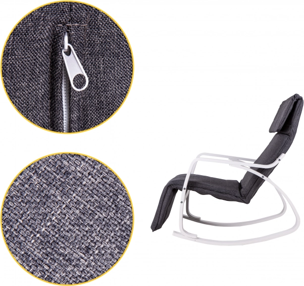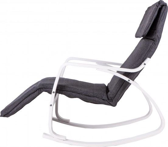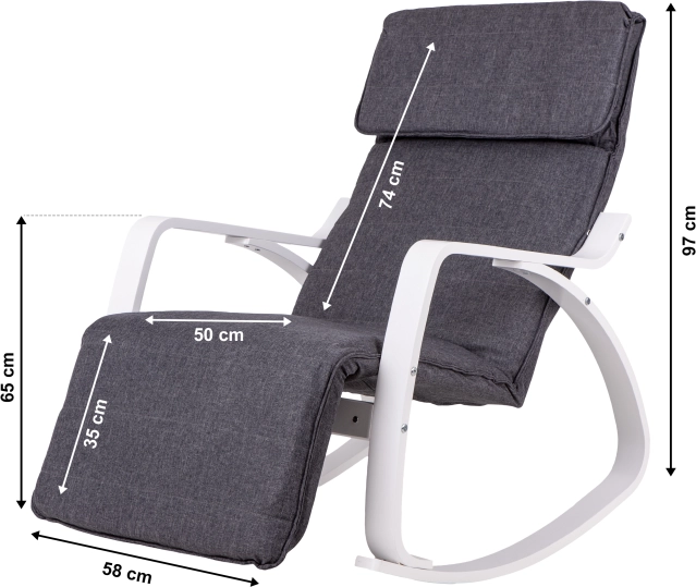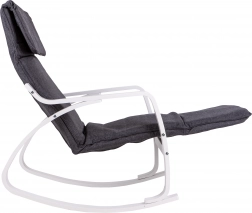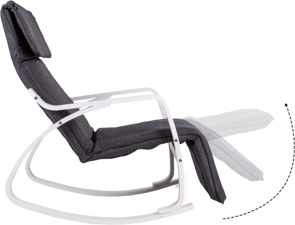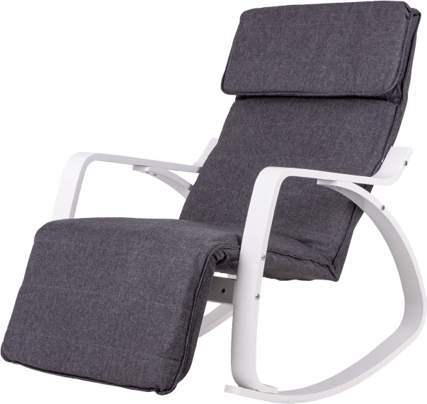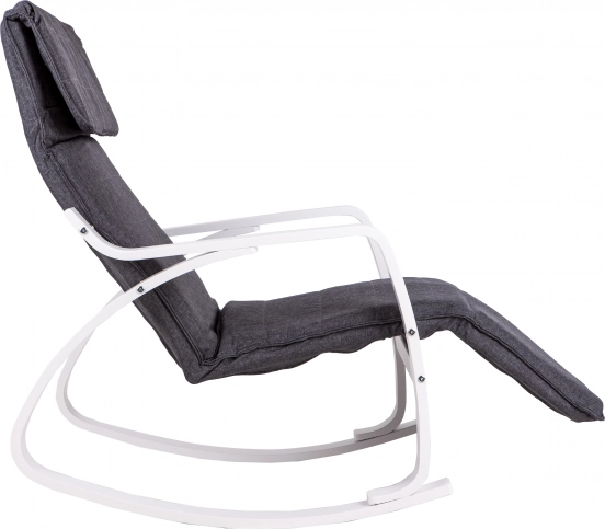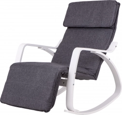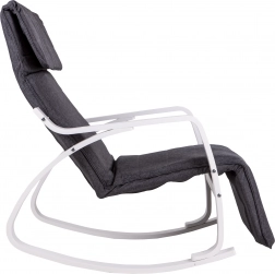 Houpací křeslo ModernHome je navrženo pro maximální pohodlí a klid. Jeho pevná kovová konstrukce v bílém provedení je doplněna šedým textilním čalouněním, které nabízí útulné sezení. Díky pětistupňové regulaci opěrky nohou si snadno nastavíte ideální polohu.