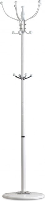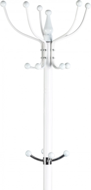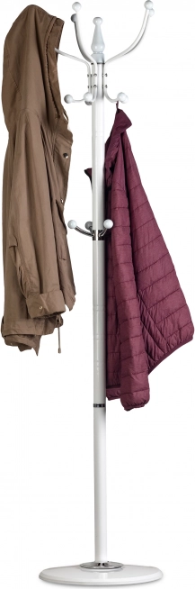 Elegantní stojanový věšák ModernHome v bílé barvě přináší stabilní kovovou konstrukci, 14 háčků pro celou rodinu a velkou kruhovou základnu pro maximální stabilitu. Díky klasickému designu se stříbrnými akcenty skvěle zapadne do předsíně, kanceláře i čekárny a udrží kabáty, bundy, tašky i klobouky přehledně na jednom místě.