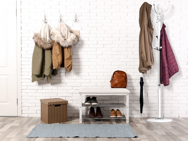 Díky nadčasovému vzhledu a kompaktním rozměrům se hodí do většiny interiérů. Bílá povrchová úprava se stříbrnými detaily dodává prostoru svěžest a pořádek, zatímco promyšlené rozmístění háčků usnadňuje každodenní používání pro dospělé i děti.