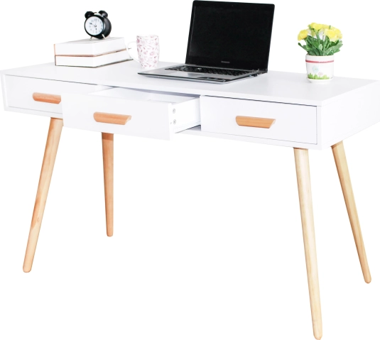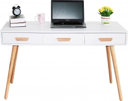 Užijte si moderní design tohoto stolu, který kombinuje bílou vrchní desku s prvky z borovicového dřeva. Zajímavá forma a pečlivé provedení zajišťují atraktivní vzhled v každém interiéru. Tento stůl může sloužit jako kosmetický stolek v ložnici, dobře navržený psací stůl v kanceláři nebo konzola v obývacím pokoji.