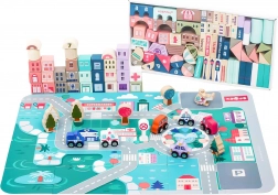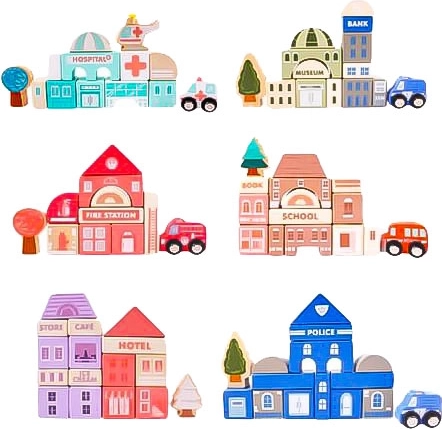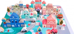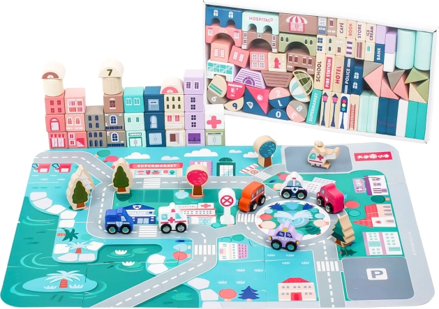 Dřevěné kostky pro děti starší 3 let jsou ideální pro rozvoj manuální zručnosti a prostorové představivosti. Set obsahuje 115 prvků, které zahrnují nejrůznější budovy jako hotel, nemocnici, banku, policejní stanici, školu a hasičskou stanici. Každá budova je detailně navržena a doplněna odpovídajícím vozidlem.