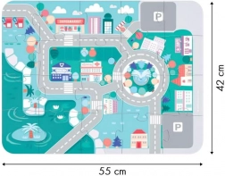 Tento set je malovanými ekologickými barvami, které jsou bezpečné pro děti. Nastavená městská cesta na puzzle podložce umožňuje vytvořit komplexní hřiště, které podporuje kreativní a interaktivní hru.