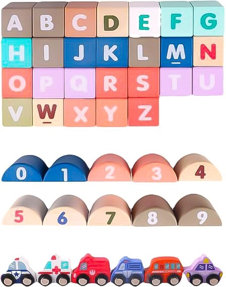 Na zadní straně kostek se nachází písmena a číslice, což podporuje rozvoj čtenářských a matematických dovedností. Čímž je nauka formována hrou, kdy děti nejen staví město, ale také poznávají jednotlivé písmenka a číslice.