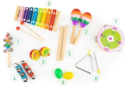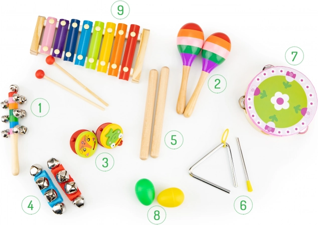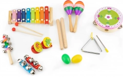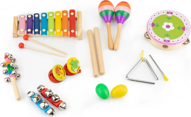 Sada zahrnuje oblíbené perkusní nástroje – od tamburíny a trianglu po maracas a činely – díky nimž dítě rozvíjí koordinaci oko–ruka, soustředění i kreativitu. Bezpečné zpracování bez ostrých hran a odolné materiály zaručují dlouhou životnost.