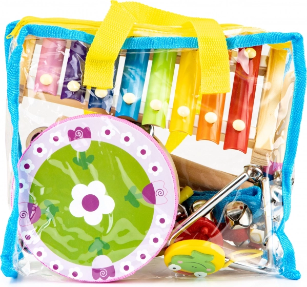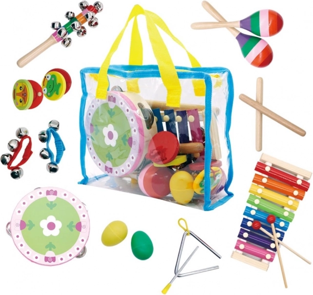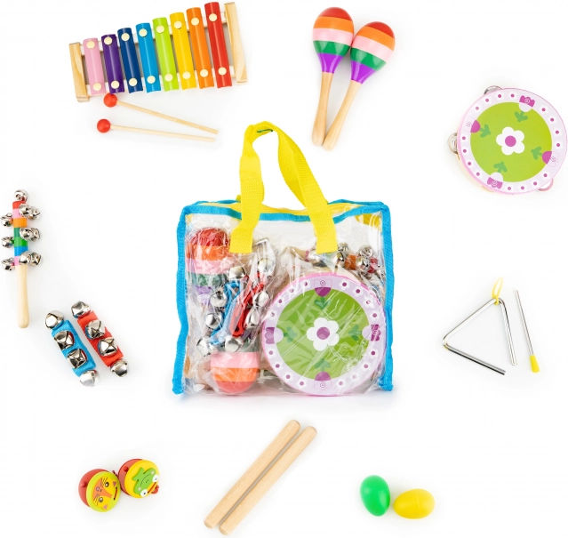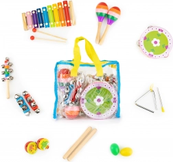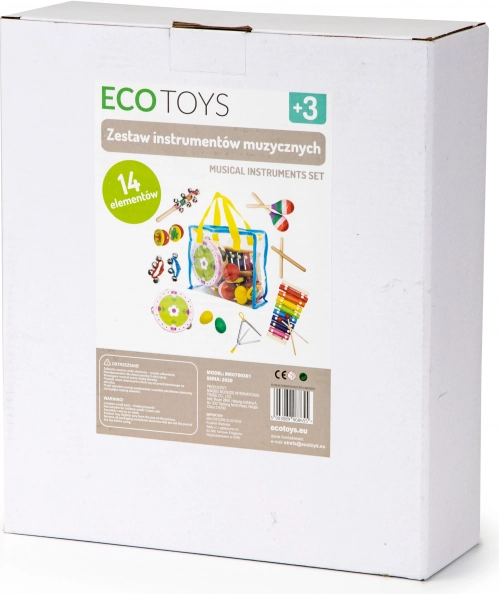 Barevná sada hudebních nástrojů pro děti od 3 let od značky ECOTOYS. Obsahuje celkem 14 kusů a praktickou průhlednou tašku pro snadné přenášení. Podporuje rozvoj motoriky, sluchového vnímání a rytmického cítění. Vyrobeno z kvalitního dřeva a kovu, bez nebezpečných prvků a s certifikací CE/EN71.