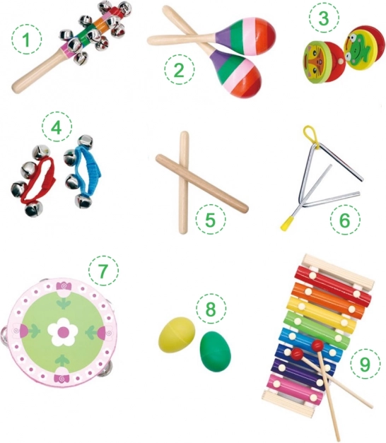- janisáry, maracas (2 ks), kastaněty (2 ks), janisáry na páscích (2 ks), rytmické paličky (2 ks), triangl, tamburína, chrastítka (2 ks), činely