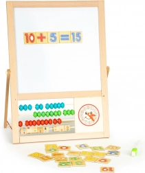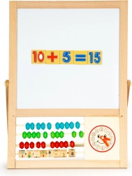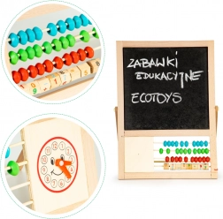 Pod tabulí je umístěno pestrobarevné počítadlo a tyčka s čísly a matematickými operacemi. Díky tomu se dítě může během hry naučit základy počítání. Hračka obsahuje také hodiny s pohyblivými ručičkami, které pomáhají s učením se času.