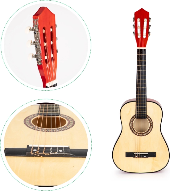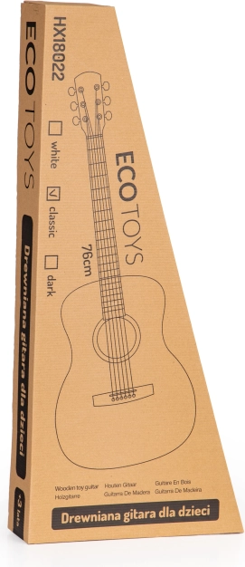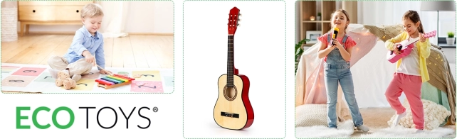 Dětská dřevěná kytara ECOTOYS: 6 strun, 18 pražců, laditelné mechaniky. Skvělá volba pro první hudební krůčky dětí od 3 let.