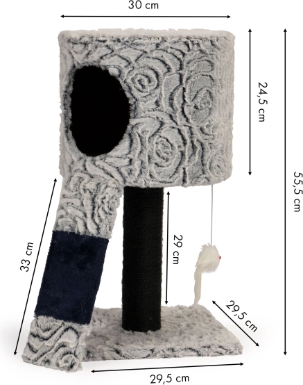 Každá plošina je potažená měkkým plyšem, poskytuje tak skvělé místo k odpočinku a pohodlí. Součástí jsou také tři visící pompony, které podněcují hru a zajišťují zábavu vašeho domácího mazlíčka. Díky stabilní konstrukci je škrabadlo jisté a bezpečné, což je důležité pro jeho stabilitu během hry.