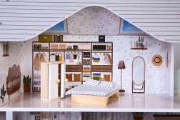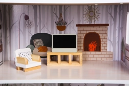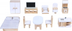 Sada obsahuje barevné dřevěné prvky jako skříň, TV stolek, křeslo, toaletu, sporák, postel, stůl a dvě židle, kuchyňskou linku a další komponenty, které proměňují domek v reálný domov v měřítku.