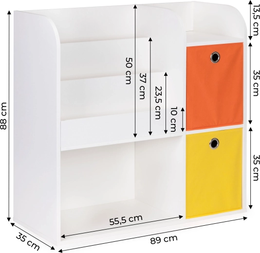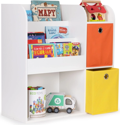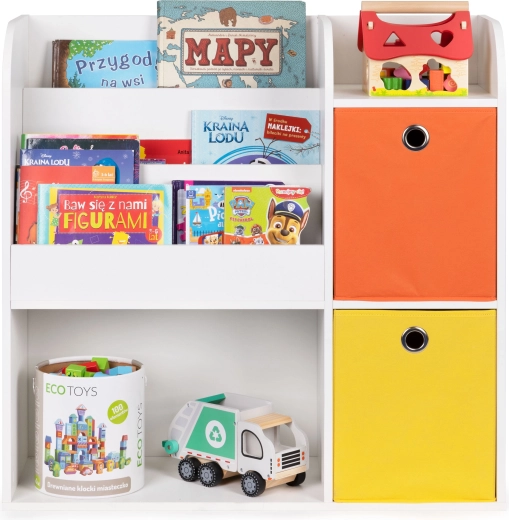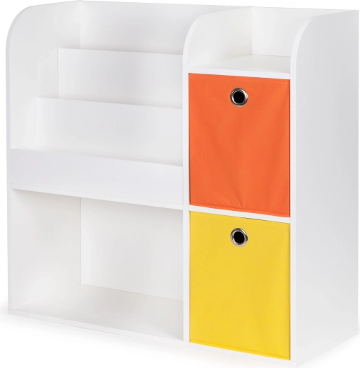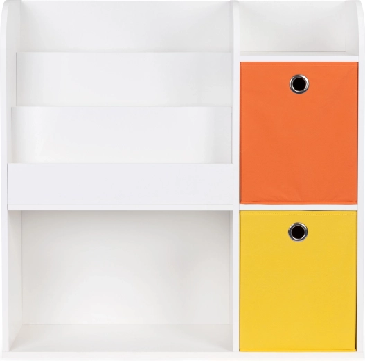 Korpus je vyroben z odolné laminované dřevotřísky s povrchem rezistentním proti poškození. Hluboké přihrádky pojmou knihy, alba a sešity, otevřené police jsou ideální na hračky a doplňky. Součástí balení jsou 2 prostorné textilní koše (oranžový a žlutý), do kterých snadno uložíte kostky či plyšáky.