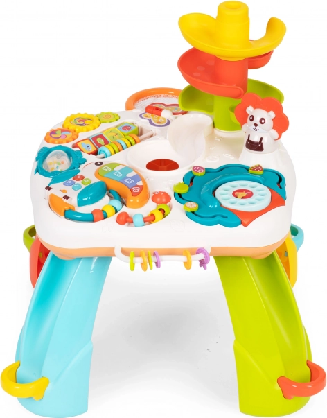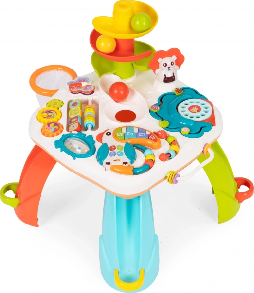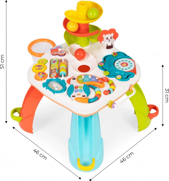 Výukový stolek je nejen skvělým způsobem, jak trávit čas , ale také podpořit rozvoj dítěte. Hračka má mnoho manipulačních hraček , například hudebního tukana, chrastítka, barevné korálky, otáčecí hračky a telefonní číselník, které pomohou rozvíjet jemnou motoriku a koordinaci.
