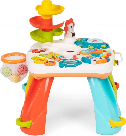 Stůl navíc obsahuje také skluzavku s míčkykterý podporuje experimentování a rozvoj kognitivních dovednostíjako je chápání příčiny a následku a prostorové myšlení.
