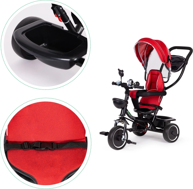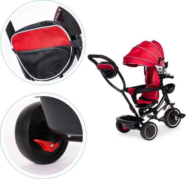 Tříkolka je vybavena měkkým opěrátkem, bezpečnými pásy a sklopnou stříškou pro ochranu před sluncem a deštěm. Je speciálně navržena pro malé děti, aby se snadněji dostaly na sedadlo.