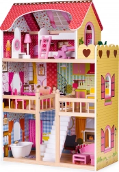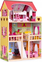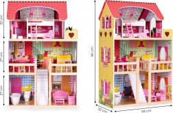 Domeček ECOTOYS zaujme promyšleným rozvržením: 3 samostatná patra, celkem 5 místností (koupelna, obývací pokoj, kuchyně s jídelnou a ložnice s terasou). Každý pokoj je laděn v jiném stylu a podporuje rozvoj představivosti i jemné motoriky. Stabilní dřevěná konstrukce, profilovaná střecha a zábradlí na patře zajišťují odolnost a bezpečnost při hře.