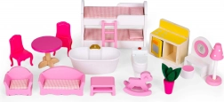 Součástí je bohatá sada dřevěného nábytku, kterou děti mohou libovolně přemisťovat a tvořit své vysněné interiéry. Hladké povrchy bez ostrých hran a certifikace CE garantují bezstarostné používání. Díky atraktivním barvám a detailnímu zpracování je domeček i dekorativním prvkem dětského pokoje.