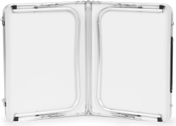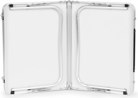 Po složení má stůl tvar kufříku s integrovaným madlem. Snadno se přenáší i skladuje v autě, karavanu či doma.