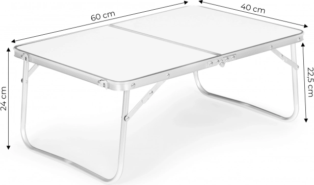 Pracovní plocha 60 × 40 cm a výška 24 cm jsou ideální k nízkému sezení. Po složení na 40 × 30 cm zabere minimum místa.