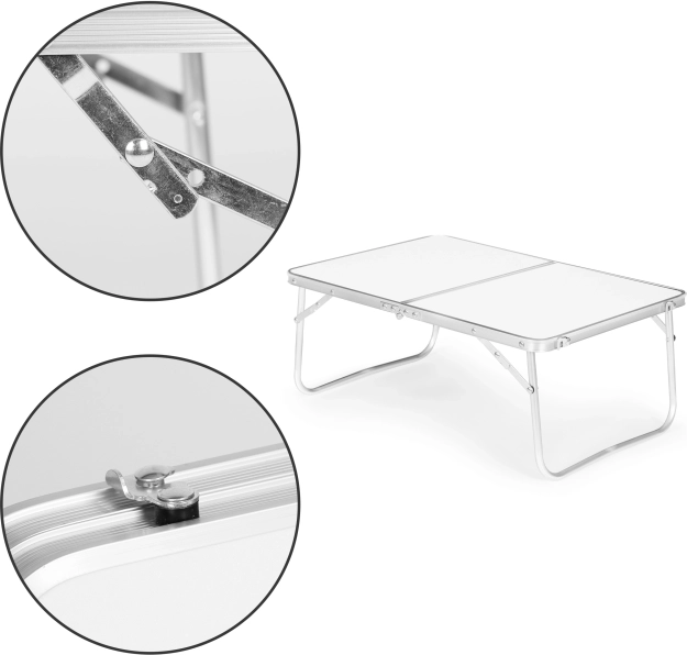 Stůl se během chvilky složí do praktického kufříku s madlem, takže se snadno vejde do kufru auta i domů do skříně. Deska o rozměru 60 × 40 cm poskytne dostatek místa pro občerstvení či hry a výška 24 cm pohodlně doplní nízké kempingové sezení.