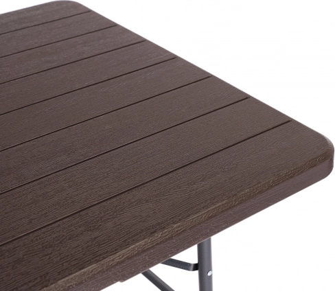Povrch s imitací dřeva je dekorativní, 100% voděodolný a odolný vůči počasí. Snadno se čistí, nešpiní se a díky tloušťce 4 cm působí pevně – nosnost stolu je až 100 kg.