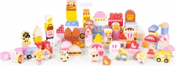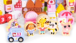 Vytvořte si sladké město plné zmrzlináren, cukráren a roztomilých detailů. Barevné dřevěné kostky s potisky jídla, čísel a písmen podporují učení hrou – děti při stavění přirozeně trénují rozpoznávání tvarů, barev a symbolů.