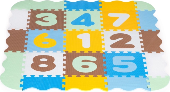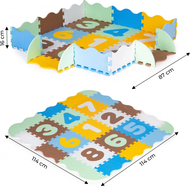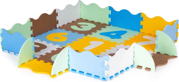 Dílky se skládají jako puzzle a umožňují vytvořit různé tvary i praktickou ohrádku, která brání kutálení hraček mimo prostor. Vyjímatelná čísla podporují vizuální učení, rozvoj jemné motoriky a představivosti – z dílků lze stavět i jednoduché 3D konstrukce, jako jsou kostky nebo věž.