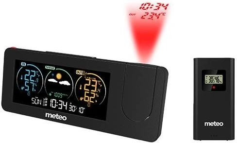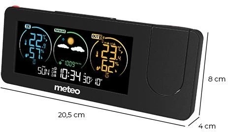 Digitální meteorologická stanice METEO nabízí komplexní řešení pro měření teploty a vlhkosti, a to jak uvnitř, tak venku. Je vybavena projektorem, který zobrazuje klíčové informace jako čas a teplotu na zvolené ploše v místnosti.