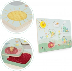 Pod každým dílkem se skrývá jiný typ materiálu. Dítě zkoumá různé struktury dotykem, čímž posiluje hmatovou percepci, pozornost i zvědavost při smyslovém objevování.