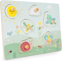 Barevné dílky s přírodními motivy děti lákají k přiřazování do správných okének. Procvičují rozpoznávání tvarů a barev a současně rozvíjejí jemnou motoriku díky pohodlným dřevěným úchytkám.
