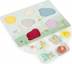 Tato smyslová vkládačka podporuje přirozenou zvídavost dětí: při vkládání dílků děti zkoumají různé barvy, tvary a struktury, čímž si posilují jemnou motoriku, koordinaci oko–ruka a kognitivní dovednosti. Každý dílek má dřevěnou úchytku pro pohodlné uchopení i malými prstíky.