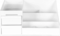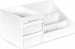 Univerzální organizér ModernHome je ideální volbou pro každodenní přehledné uložení věcí. Díky promyšlenému členění nabízí různě velké přihrádky pro rtěnky, laky na nehty, štětce, šperky i kancelářské drobnosti. Dva praktické šuplíky bezpečně schovají menší předměty, které chcete mít po ruce, ale bez nepořádku.